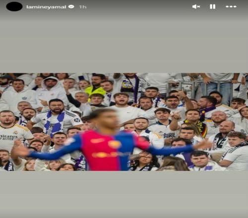 而在比赛开始前一天,亚马尔又在社交媒体上晒出了上赛季巴萨客场4-0皇马时的庆祝图。