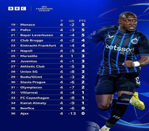 欧冠4轮后积分榜巨变!仅3队全胜+拜仁领跑,两支前冠军4连败垫底