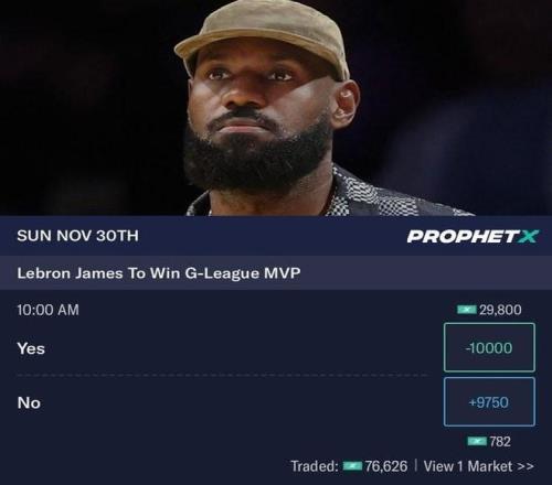 博彩公司根据目前詹姆斯的情况进行了开盘,投注项目为“詹姆斯能否夺得本赛季NBA G联赛MVP”,能的赔率为-10000,不能则为+9750。根据赔率推算,博彩公司给詹姆斯定下的夺MVP概率高达99%。