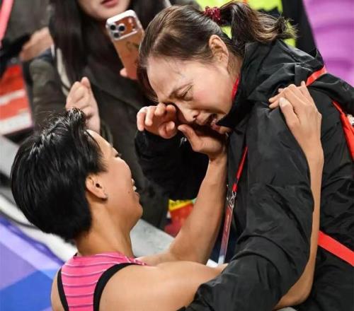 夺冠之后的刘景扬第一时间奔向看台和妈妈紧紧拥抱。妈妈热泪盈眶,她非常激动地说着:“她连教练都没有,她太艰难了,没有人看好她,你们不知道她很不容易。你知道她经历了多少吗?人家都不看好她。太不容易了。”
