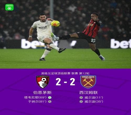 北京时间11月22日,英格兰足球超级联赛第12轮展开角逐,伯恩茅斯坐镇主场迎战西汉姆联。比赛中,西汉姆联率先打破僵局,威尔逊接阿雷奥拉的精准输送后成功破门,为客队取得领先。随后,托迪博送出助攻,威尔逊再次攻破主队球门,完成个人梅开二度。 易边再战,伯恩茅斯展开反扑。塔韦尼耶在点球机会中冷静施射,为主队扳回一城。比赛进入尾声阶段,塞内西送出关键传球,于纳尔把握机会破门,帮助球队将比分扳平。最终,双方以2比2握手言和。