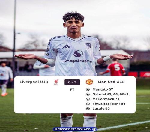 本场比赛,曼塔托、JJ-加布里埃尔(打进3球)、布拉德伯里、吉姆-思韦茨和卢萨莱均取得了进球,帮助曼联U18以7-0的比分大胜利物浦U18,这使得曼联U18升至积分榜第二位。