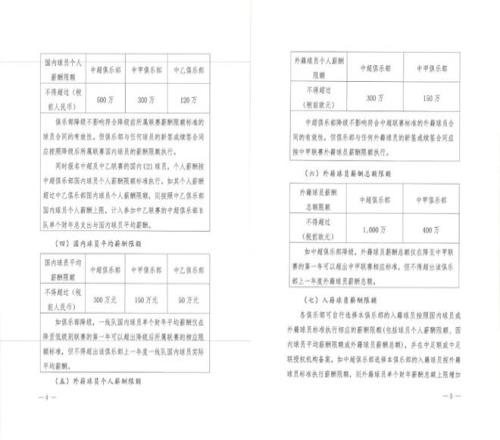 总体上各项指标延续性较强,值得留意的变化在于:其一,入籍球员个人薪酬限额如果执行外籍球员个人薪酬限额标准,则外籍球员个人薪酬限额增加200万欧元(税前,下同)到1200欧元(中甲增加80万欧元到480万欧元),但外援本身的薪酬限额仍旧是1000万欧元和400万欧元;其二,同时参加中超和中乙的俱乐部(即拥有中超B队的俱乐部),需同时满足俱乐部总支出不超过中超总支出限额要求、参加中乙联赛的B队总支出不超过中乙总支出限额要求;其三,同时报名中超及中乙联赛的国内U21球员,个人薪酬按中超俱乐部国内球员个人薪酬限额标准执行,如其个人薪酬超过中乙俱乐部国内球员个人薪酬限额,则按照中乙俱乐部国内球员个人薪酬上限,计入参加中乙联赛的中超俱乐部B队单个财年总支出与国内球员平均薪酬。
