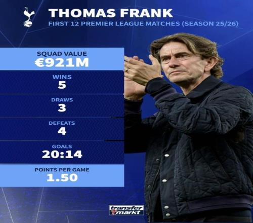 来到热刺之后,这份榜单里的表现是20进14失、5胜3平4负排第9,本质上延续了他“先把防守和比赛强度立住,再慢慢加进攻配置”的思路:净胜球为正、输得不算多,说明整体框架已经搭起来了,但进攻端还偏谨慎,更多靠战术纪律和定位球吃饭,而不是强行打成真正的争冠强度。