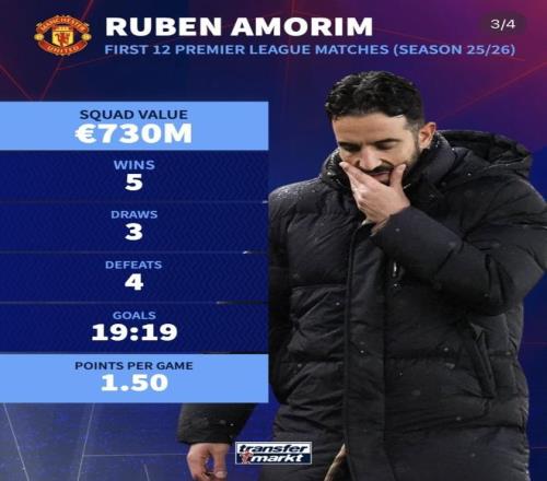但去了曼联之后,现实就明显没那么顺利了:上任到现在54场只赢了21场,胜率不到40%,成绩起伏大、杯赛表现也一般。折射到这份榜单上的数据——19进19失、5胜3平4负排第10——很像他在英超的真实处境:战术理念不落后,强调前场压迫与快速推进,但在阵容匹配、节奏控制和防线保护上始终找不到在葡超那种“攻守两端都占优”的感觉,只能算是勉强维持在中游偏上的水平。