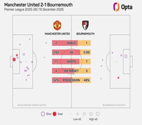 据Opta统计,曼联对阵伯恩茅斯的比赛上半场非点球预期进球值(3.6)、射门次数(24次),以及在对方禁区内的触球次数(41次)均为本赛季英超上半场最多。