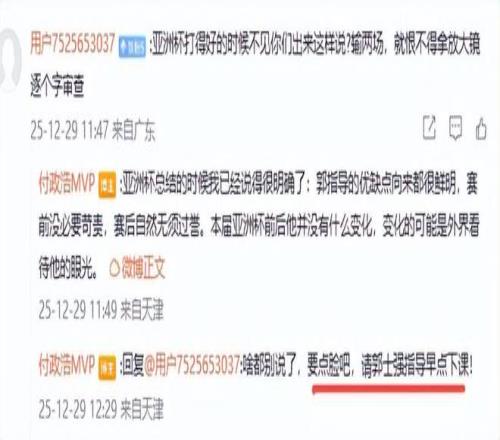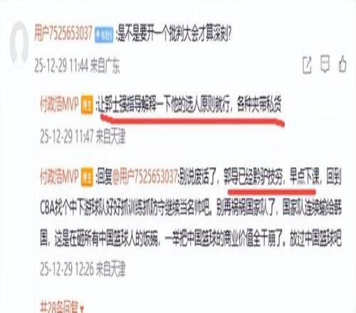 最近,名记付政浩对国家队和国手的表现作了评论,他表示,看了男篮世预赛的蹩脚表现,试问谁不深感压力呢?但篮协的紧迫感和责任感又体现在哪呢?比赛都结束了一个月了,说好的深刻总结又总结到哪了?他在与球迷的互动中更是痛斥了郭士强,“让郭士强指导解释一下他的选人原则就行,各种夹带私货”,“郭导已经黔驴技穷,早点下课,回到CBA找个中下游球队好好抓训练抓防守继续当名帅吧。别再祸祸国家队了,国家队连续输给韩国,这是在砸所有中国篮球人的饭碗,一举把中国篮球的商业价值全干崩了。放过中国篮球吧”,付政浩最后激动地对郭粉说:啥都别说了,要点脸吧,请郭士强指导早点下课!