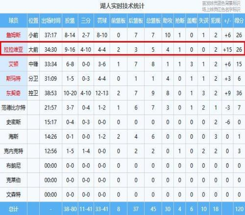 东契奇36分9板8助、詹姆斯26分7板10助、拉拉维亚26分5板4助、艾顿15分8板1助3帽、范德比尔特7分7板3助、斯玛特6分1板4助、克内克特3分2板、海斯1分6板