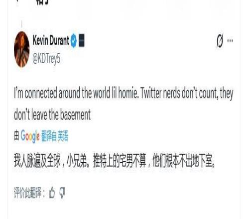 杜兰特则毫不客气的对这两条留言回复道:“我的人脉遍及全球,推特上那些宅男们不算,他们哪儿也不去,整天窝在地下室里。”