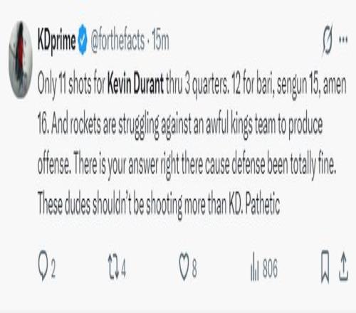 第三节杜兰特还是打无球,他本人要球的欲望也不高,感觉杜兰特对火箭的竞争性略显失望,单节10分钟只有2次出手单节拿到3分2助攻,而申京单节出手8次只命中2个,杜兰特三节15分5助攻4篮板。火箭球迷:我不理解,第三节为什么KD只有一个出手。