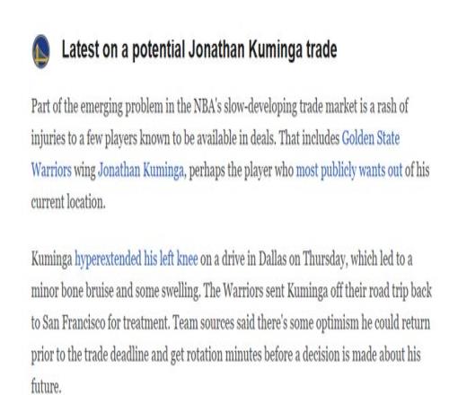 勇士队记Anthony Slater坦言,在巴特勒赛季报销后,库明加离队的可能性已经显著降低。