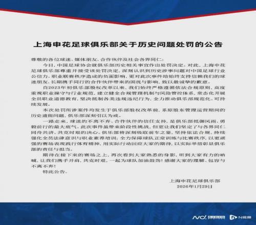 过去两个赛季的中超亚军上海申花官方表示“尊重并接受处罚。”