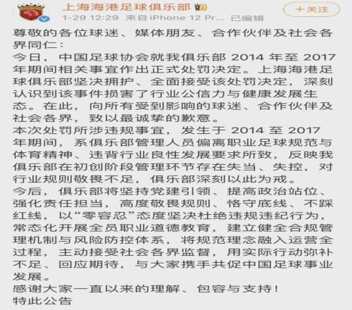 过去三个赛季的中超冠军上海海港表示“全面接受该处罚决定”。
