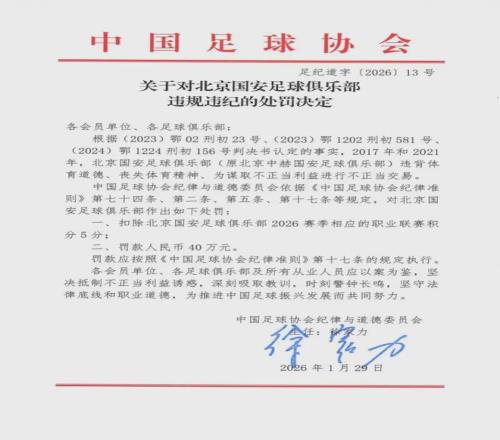 在中国足协公布的对北京国安的罚单中显示:2017年和2021年,北京国安(原北京中赫国安)违背体育道德、丧失体育精神、为谋取不正当利益进行不正当交易,扣除北京国安足球俱乐部2026赛季相应的职业联赛积分5分,罚款人民币40万元。