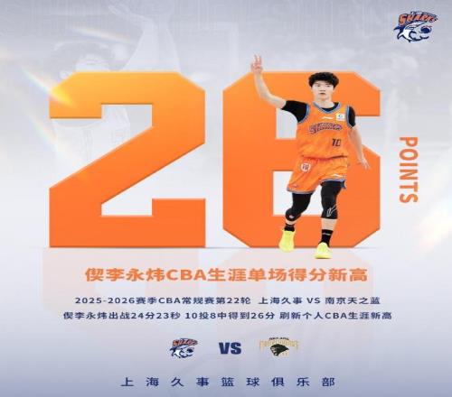 上海新星偰李永炜迎来生涯之夜,他狂轰26分6记三分,创造生涯单场得分新高纪录,率领上海114-80大胜同曦巩固联赛第二。