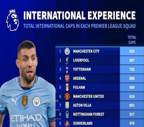 英超俱乐部球员国家队出场数榜:曼城、利物浦前2,切尔西第18