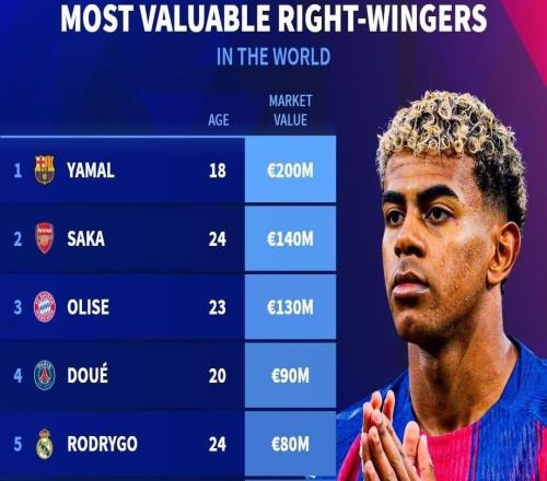 德转列右边锋身价榜:亚马尔2亿欧居首,萨卡第二奥利塞第三