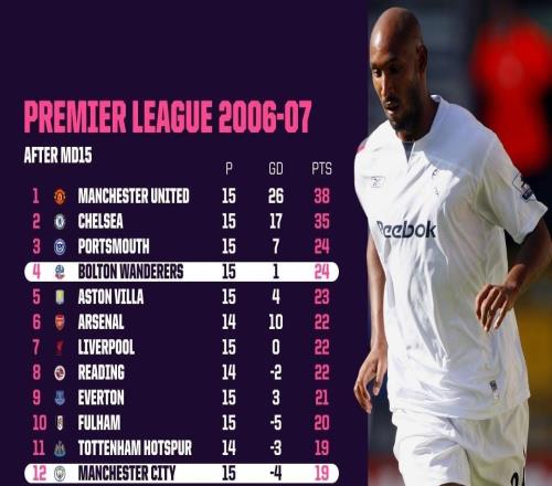 本赛季英超前15轮第412分差小于5分,上一次发生在0607赛季