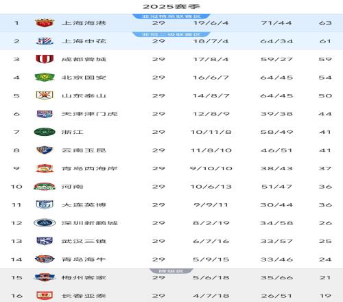 北京时间11月22日,2025赛季中超联赛结束了末轮的全部8场角逐。最终,上海海港2分优势力压上海申花卫冕,夺得队史第4座中超冠军。保级方面,梅州客家成为第2支降级队伍,与长春亚泰携