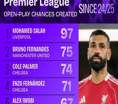 据数据网站Squawka统计,自2024-25赛季以来,萨拉赫是英超运动战创造机会次数最多的球员,布鲁诺-费尔南德斯排名第二。自2024-25赛季以来英超运动战创造机会榜1 萨拉赫 97次2 布